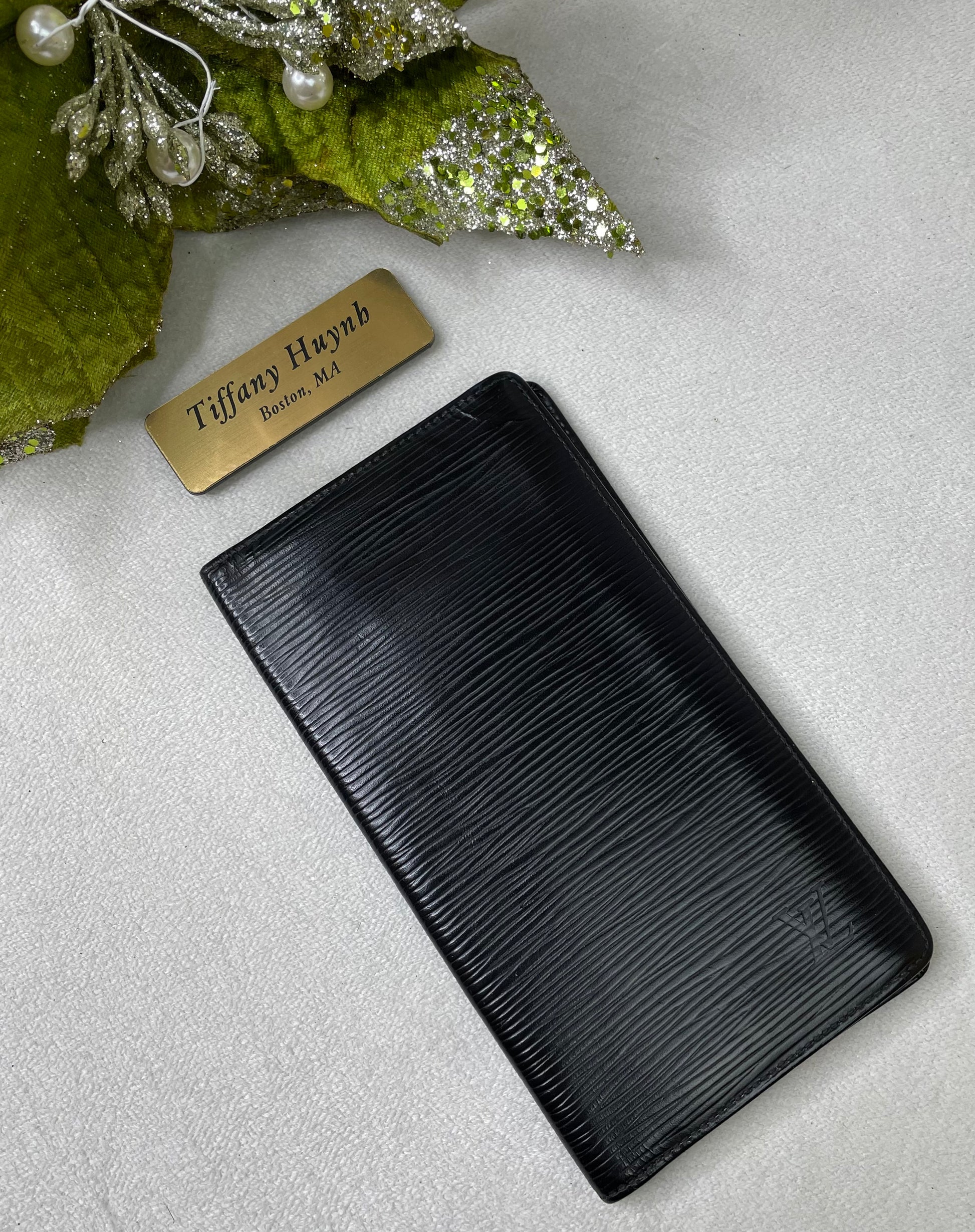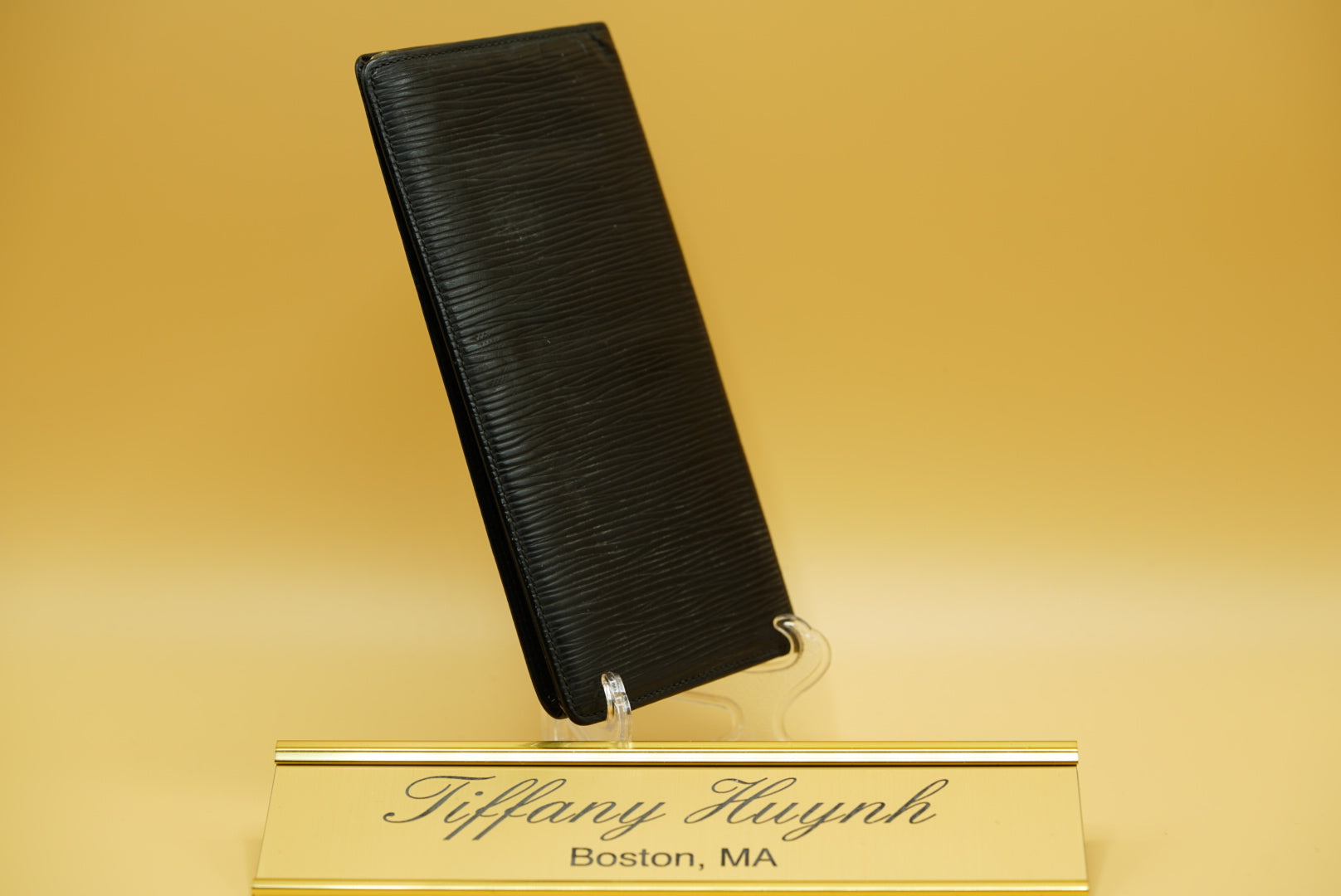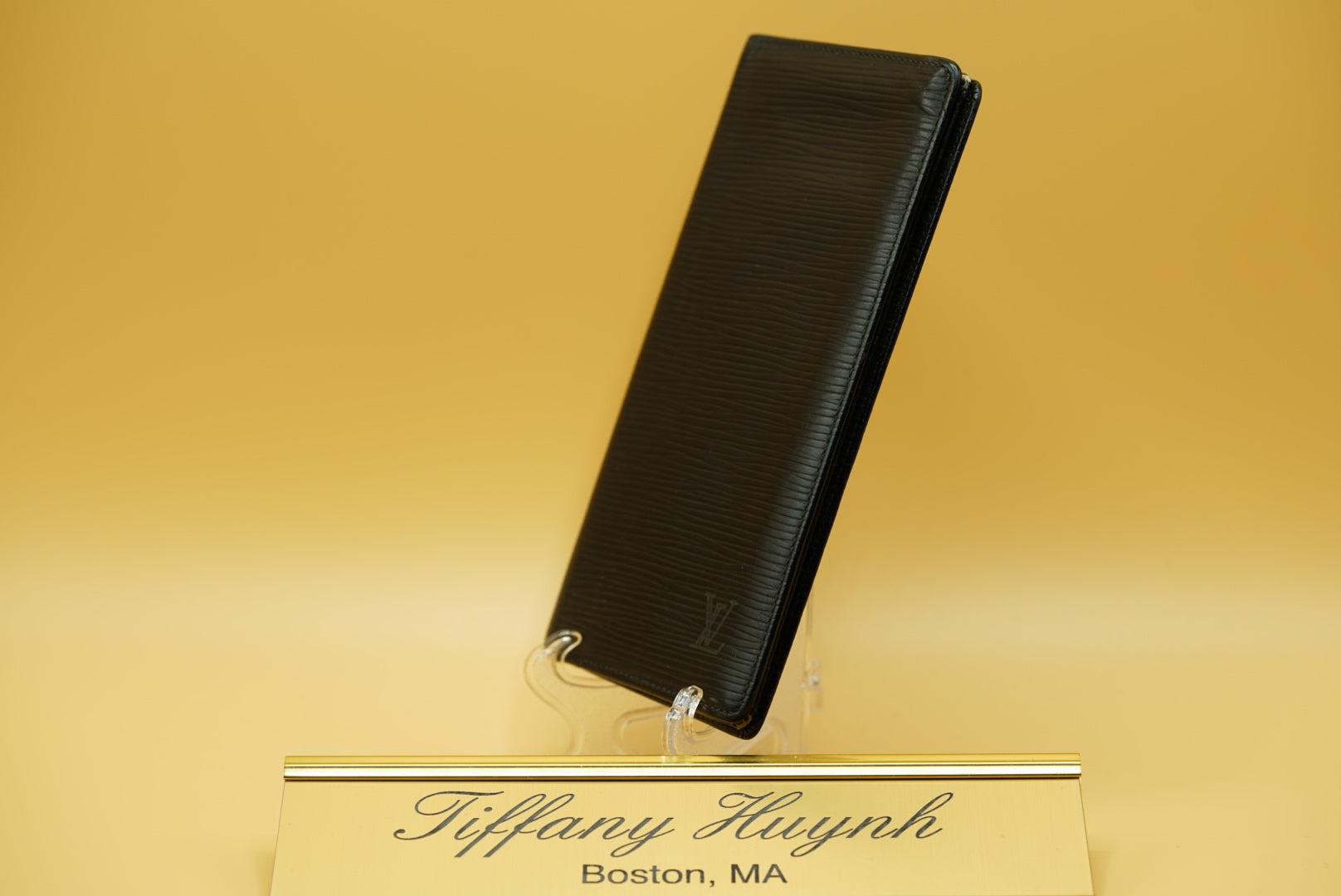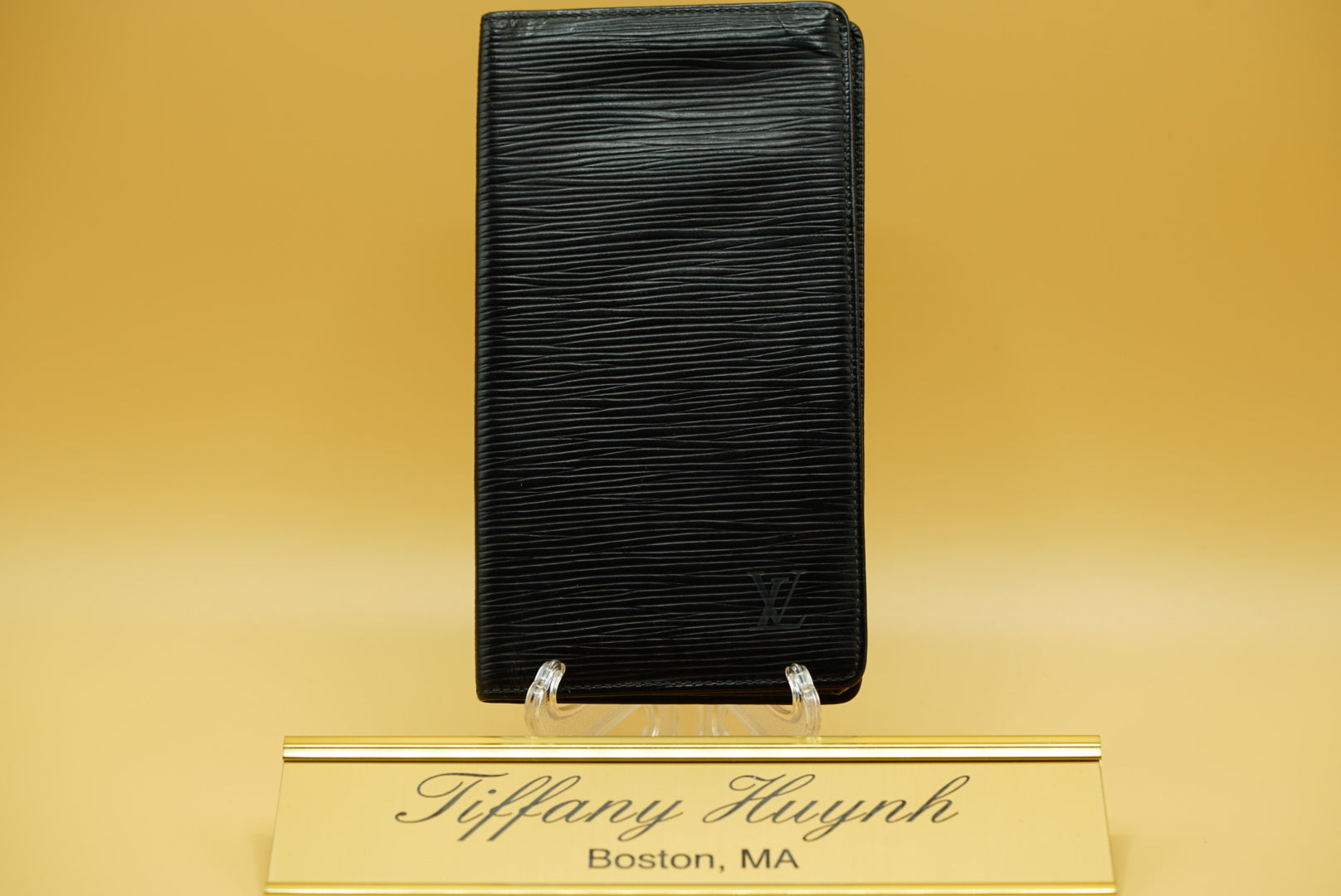 This chic checkbook wallet is finely crafted of Louis Vuitton signature textured epi leather in black. The wallet opens to a black cross-grain leather interior, an elegant way to organize your essentials such as checkbook, bills and credit cards.