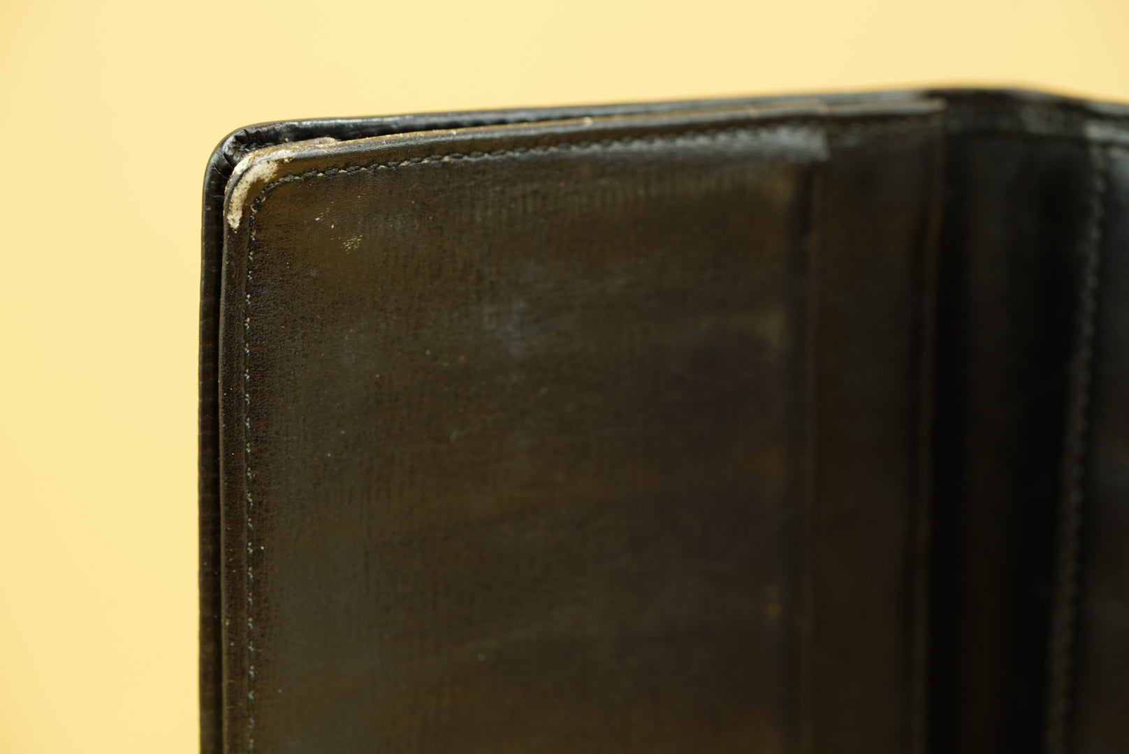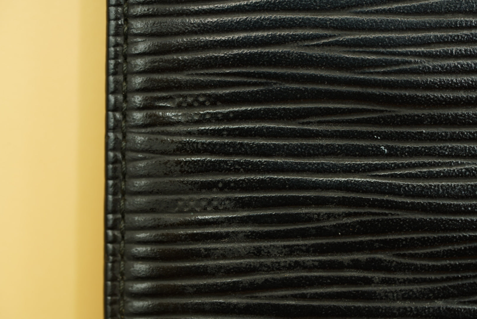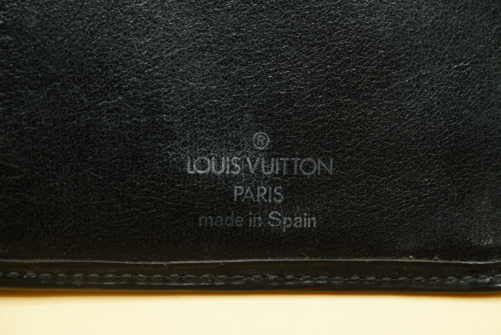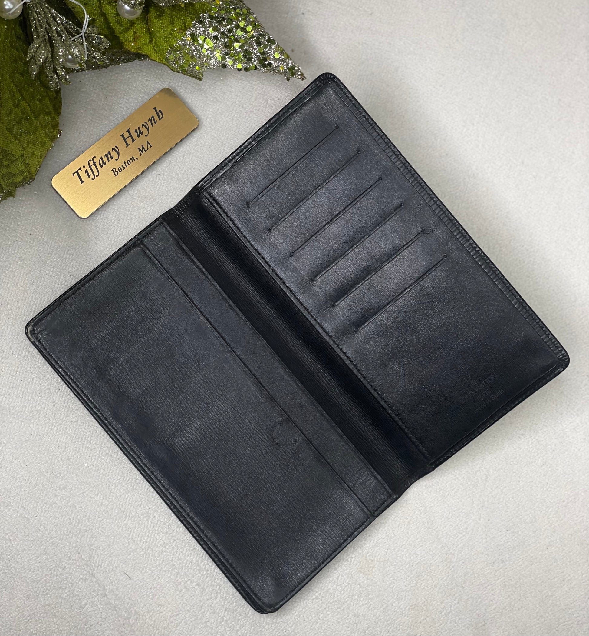 This chic checkbook wallet is finely crafted of Louis Vuitton signature textured epi leather in black. The wallet opens to a black cross-grain leather interior, an elegant way to organize your essentials such as checkbook, bills and credit cards.