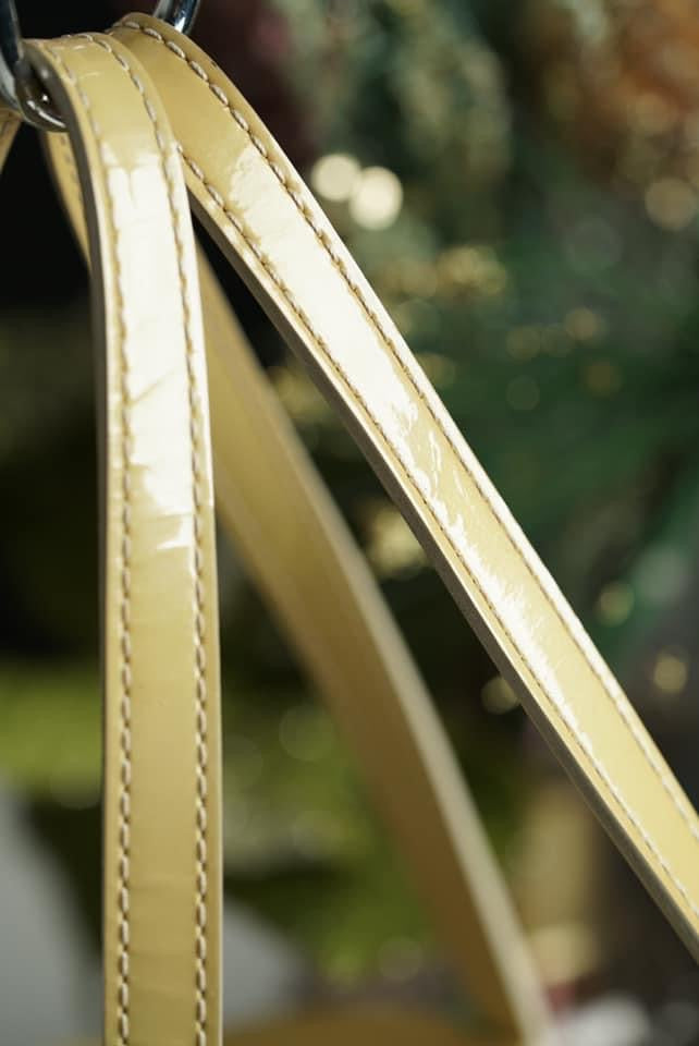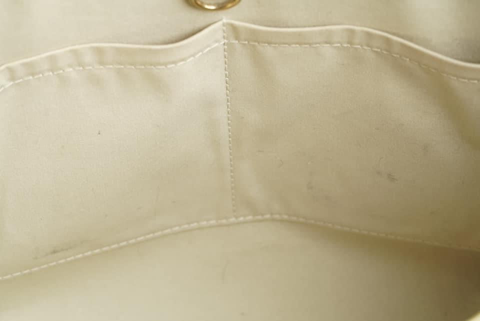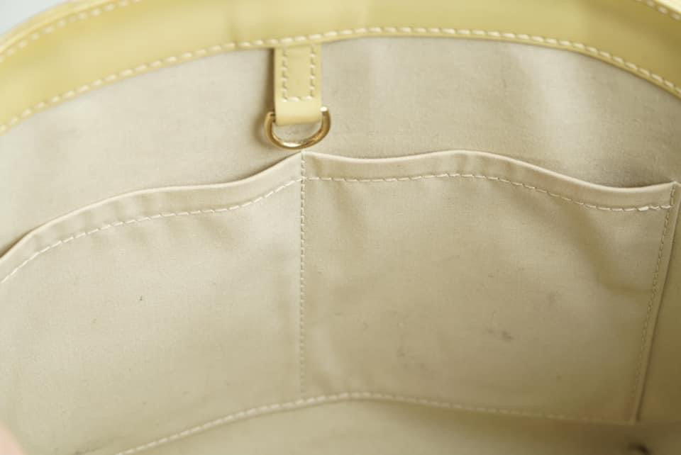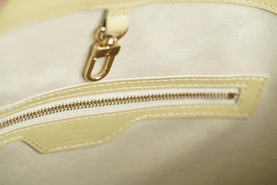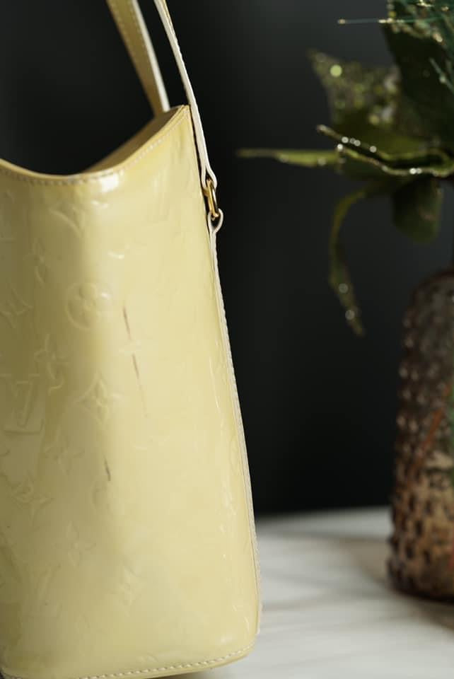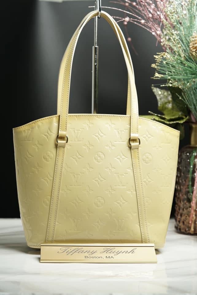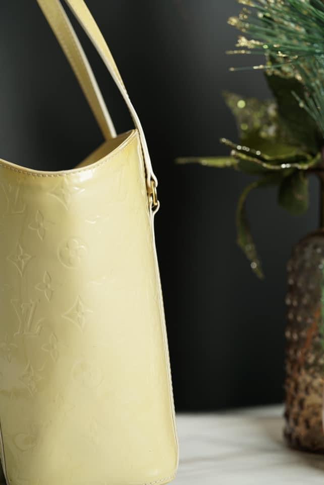 This stunning tote is created out of brilliant Louis Vuitton monogram embossed vernis patent leather. The bag has leather strap top handles, polished brass hardware and opens up to a spacious fabric interior with a zipper and patched pocket.