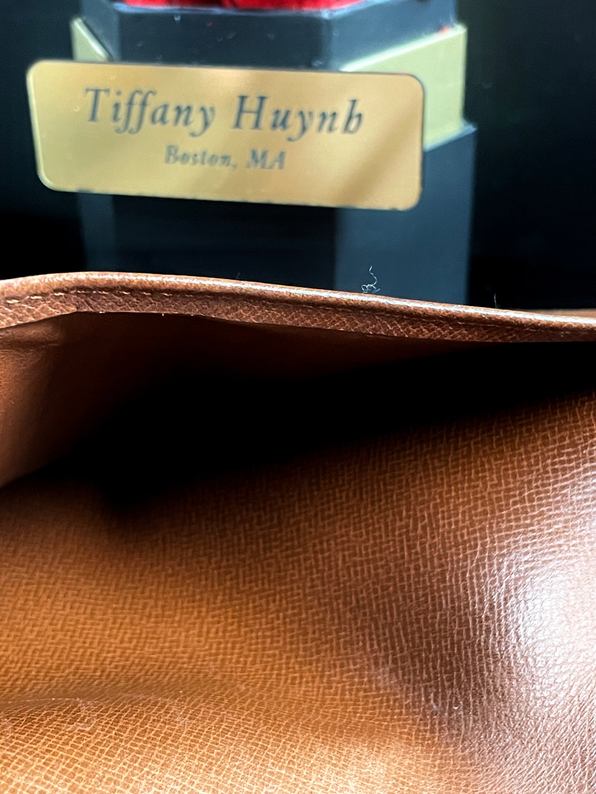 The wallet opens to a terra-cotta cross-grain leather interior with card slots and patch pockets. This is a marvelous checkbook wallet that is also large enough to fit a pocket agenda!