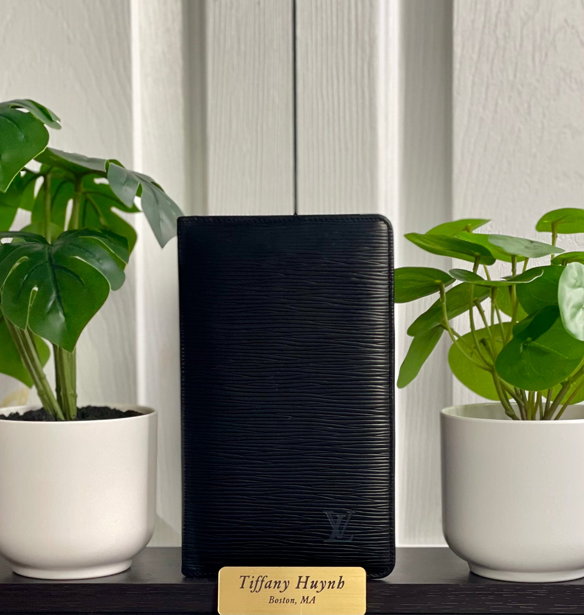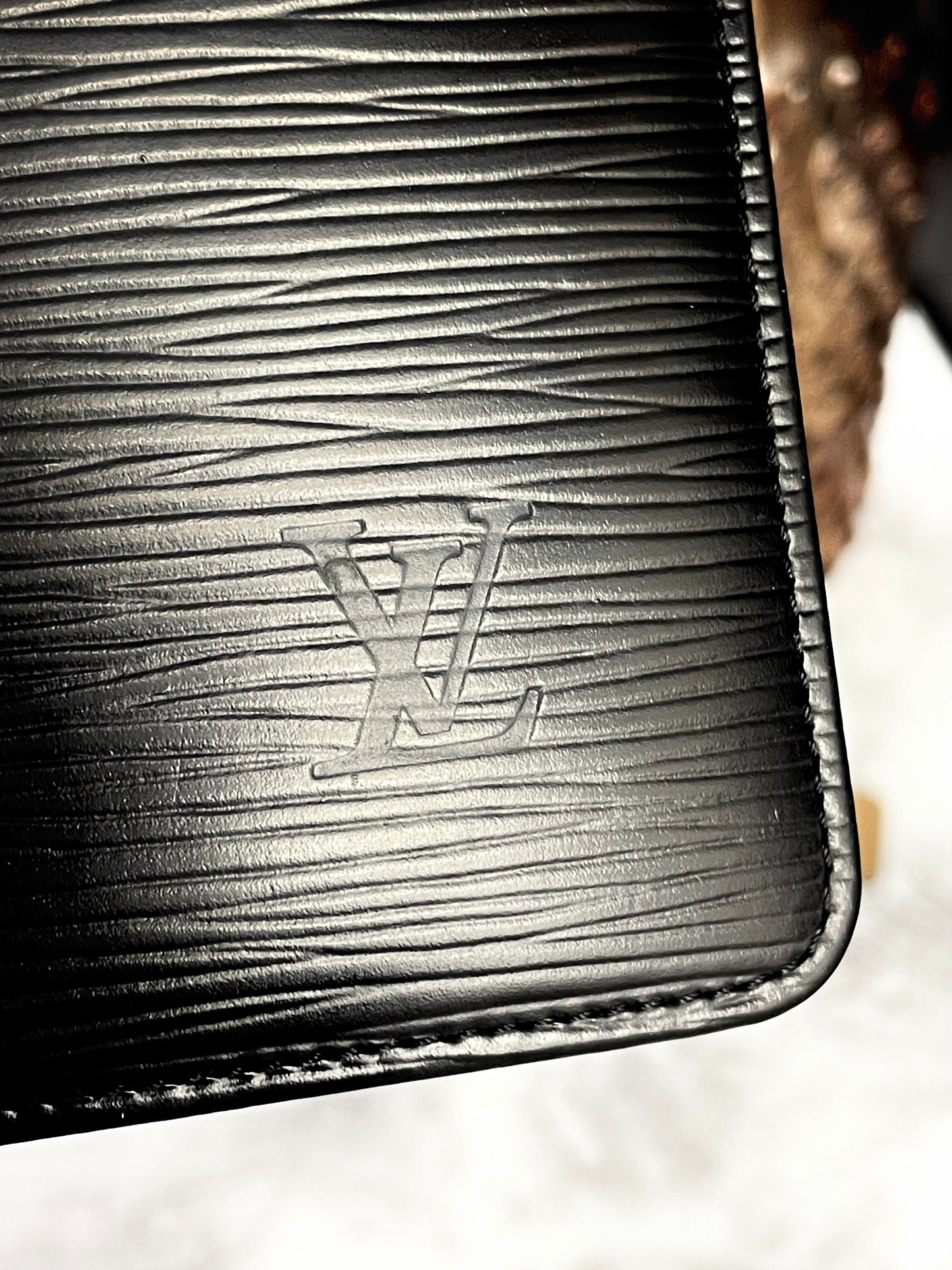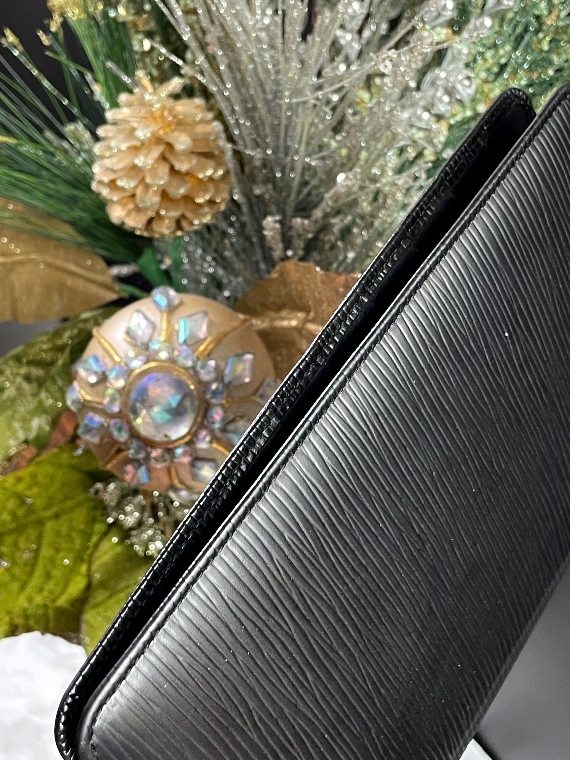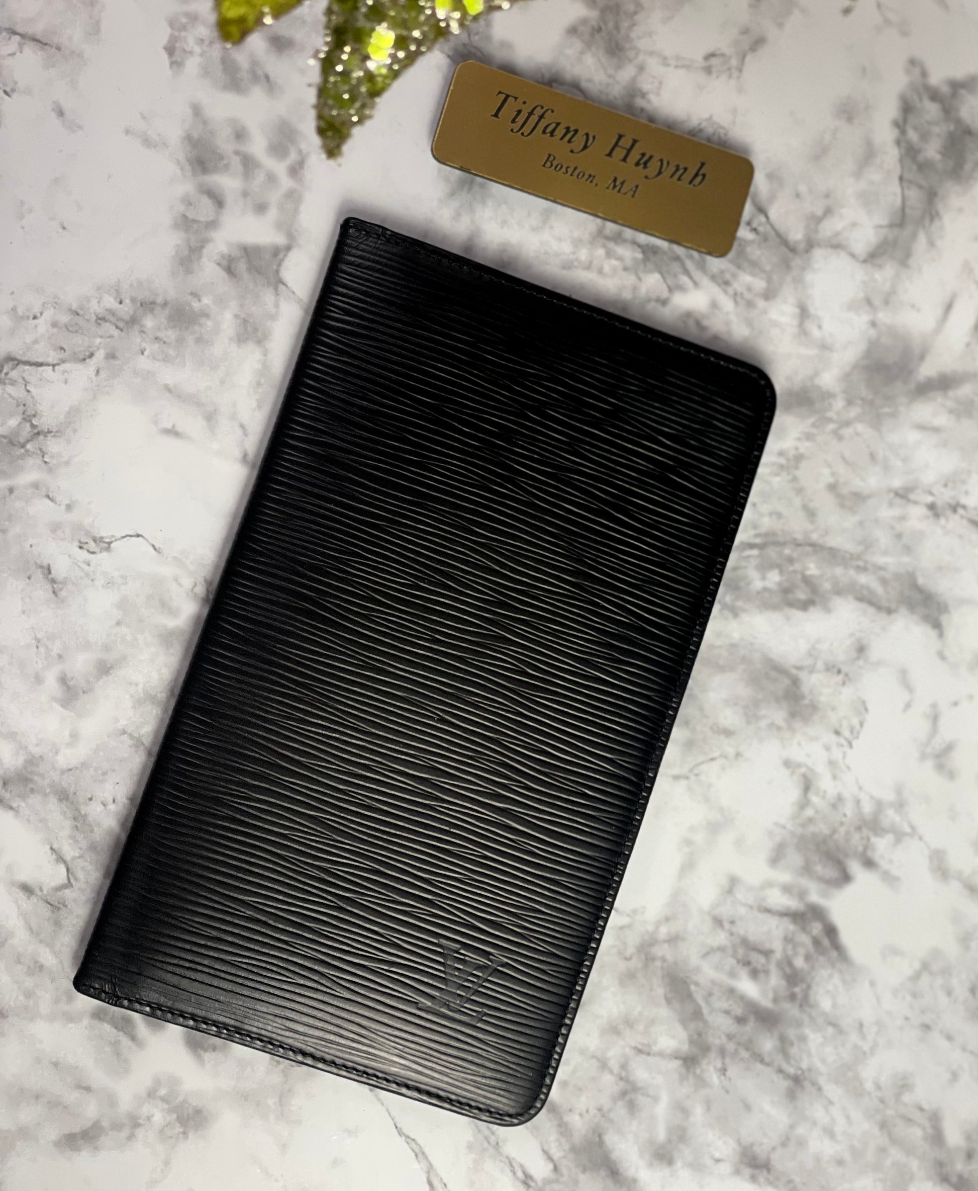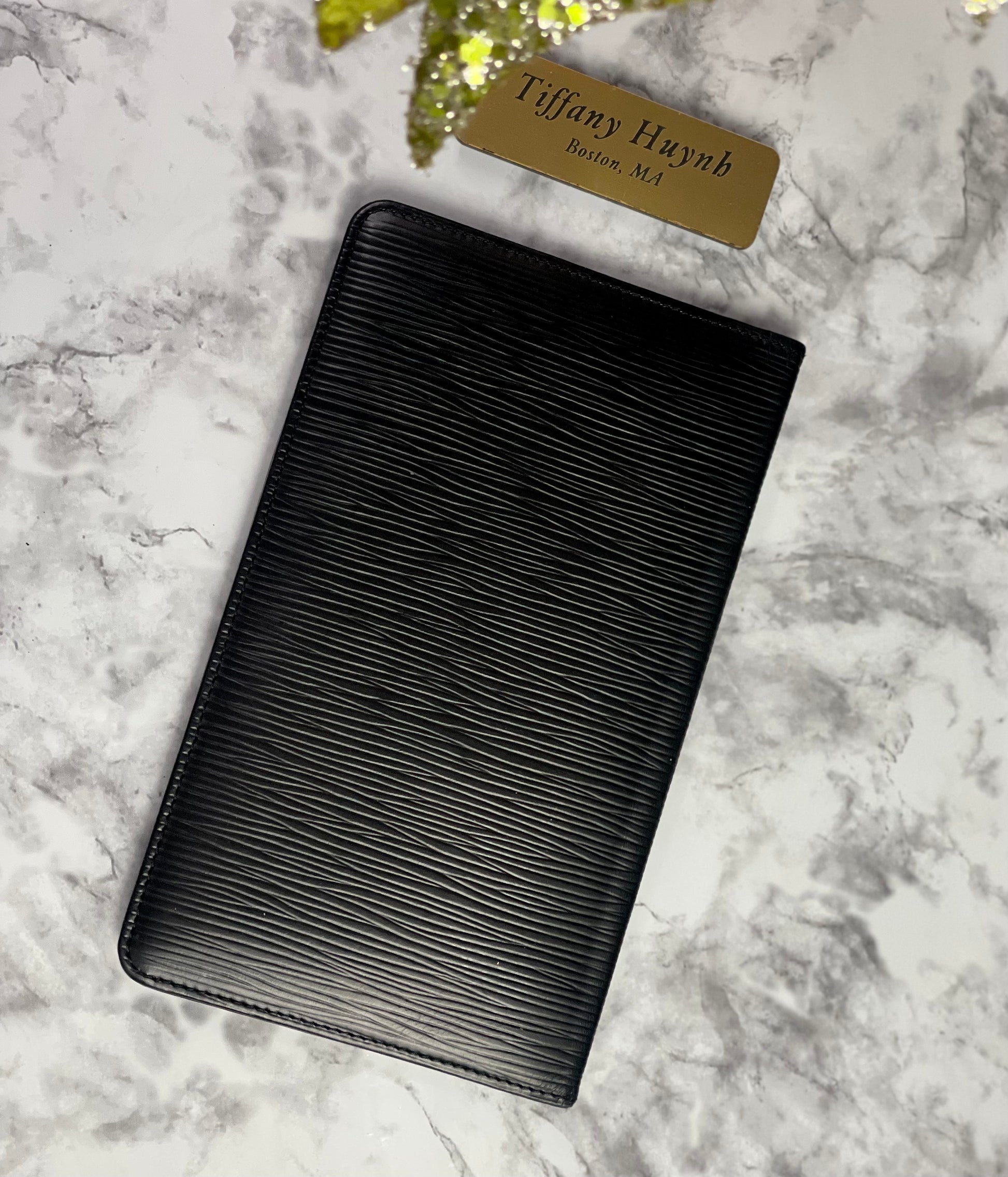 This chic checkbook wallet is finely crafted of Louis Vuitton signature textured epi leather in black. The wallet opens to a black cross-grain leather interior, an elegant way to organize your essentials such as checkbook, bills and credit cards.