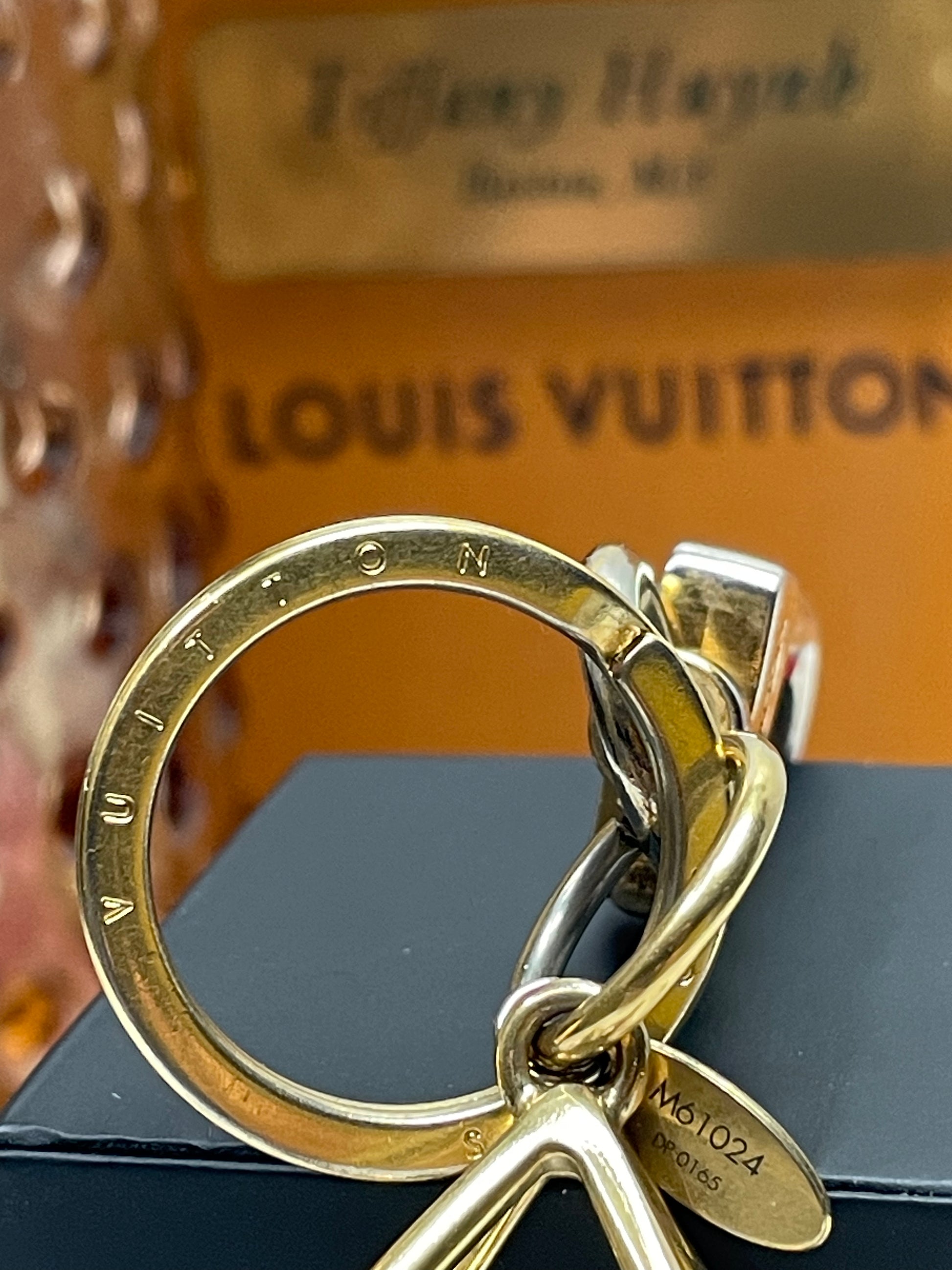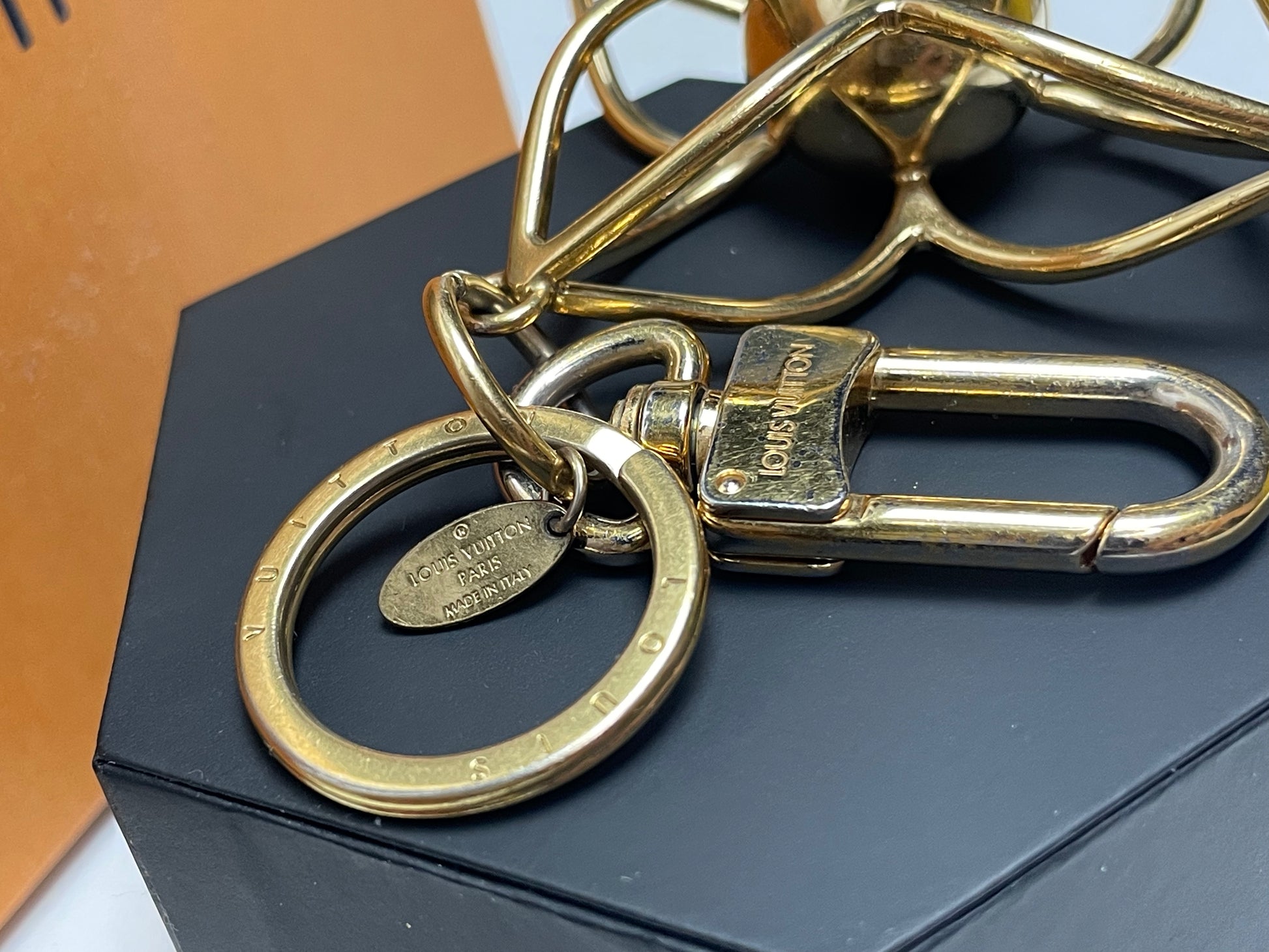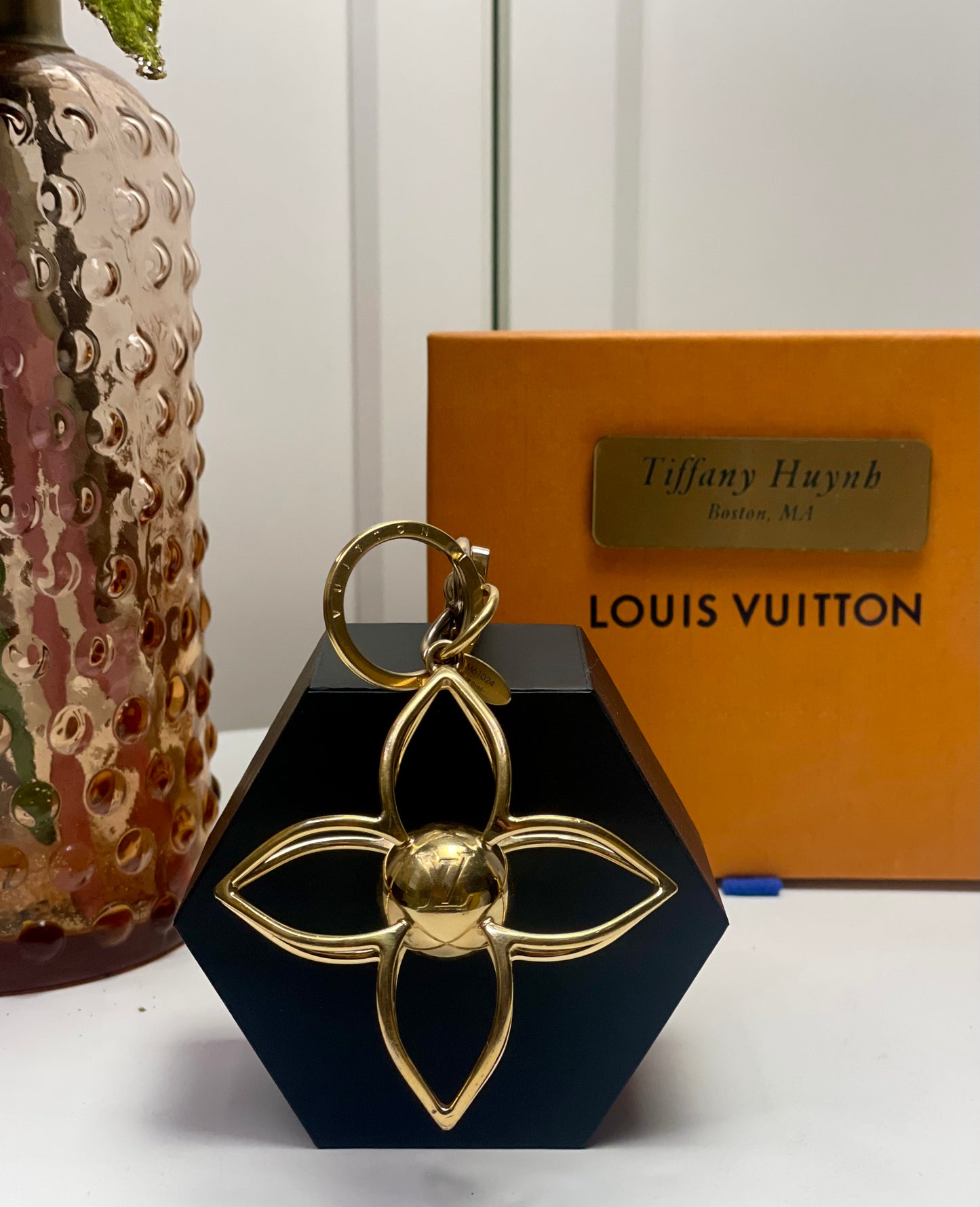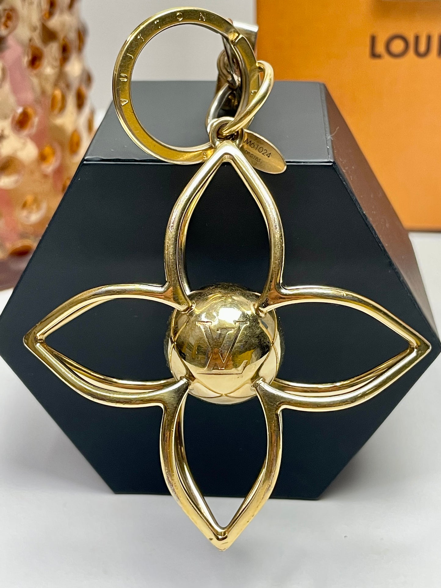 This authentic Louis Vuitton gold charm features an intricate monogram flower with an LV symbol engraved sphere at the center. it also has Louis Vuitton engraved on the Keyring and clasp which gives the charm a sophisticated look throughout.