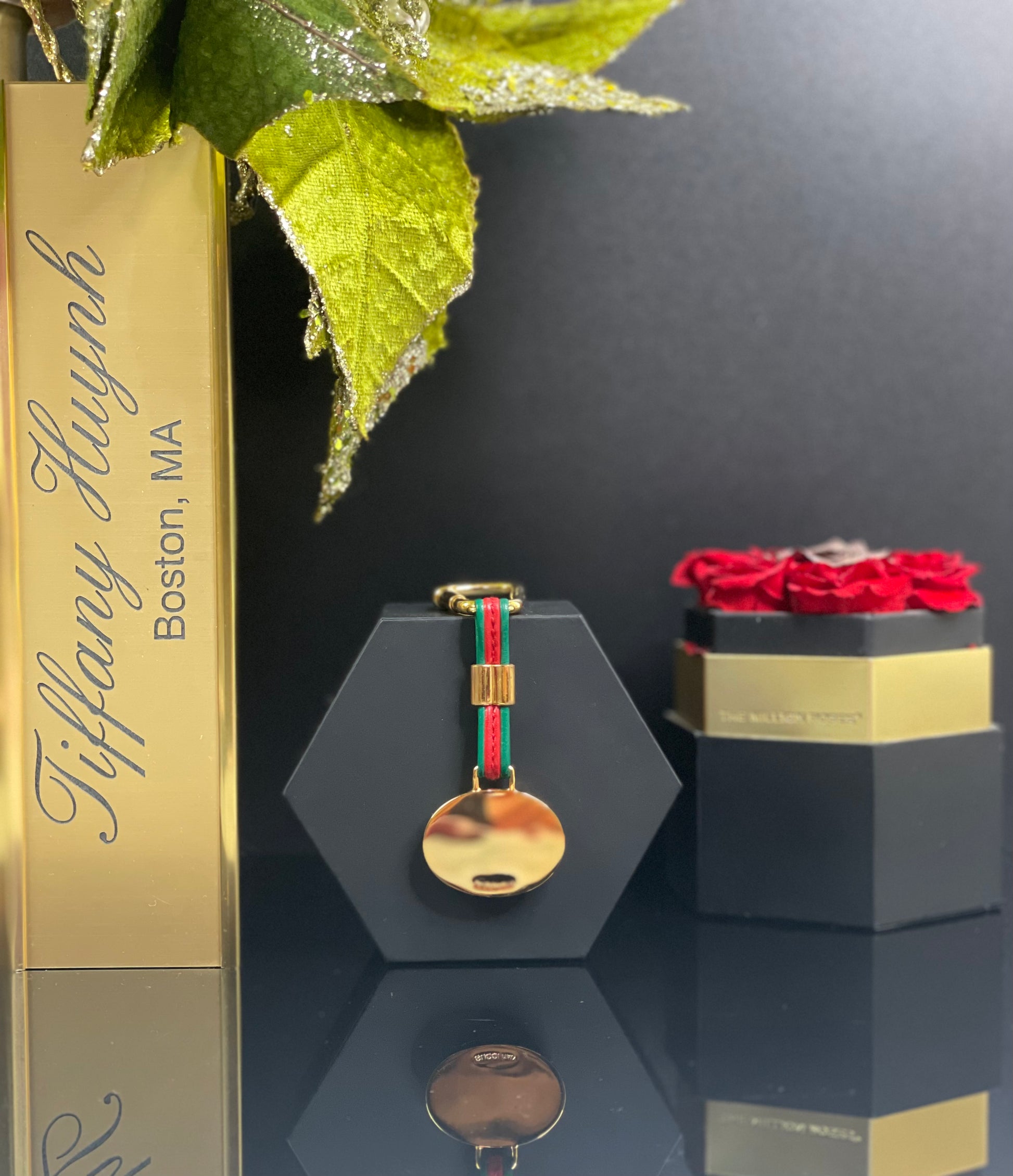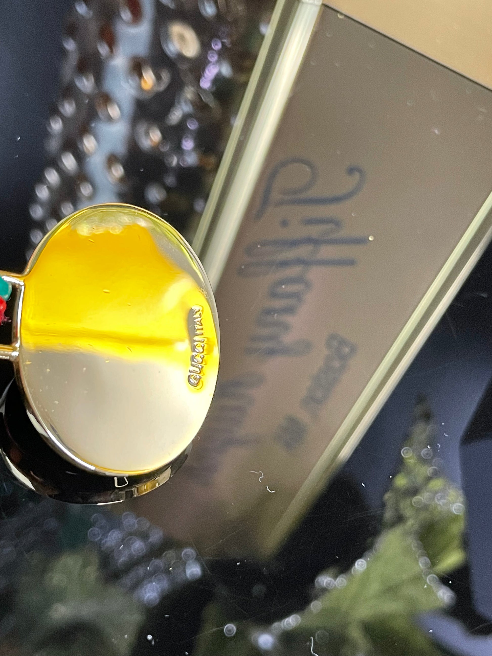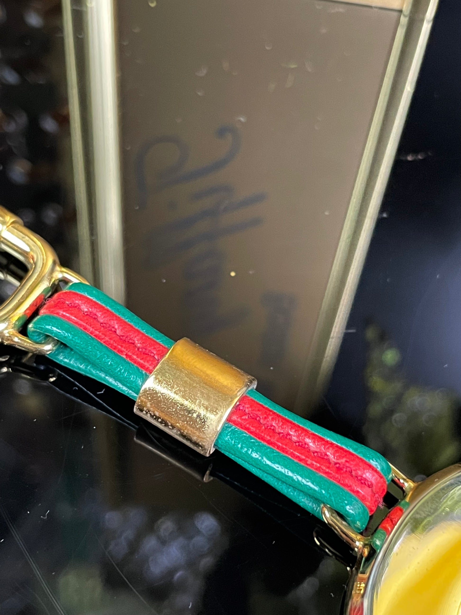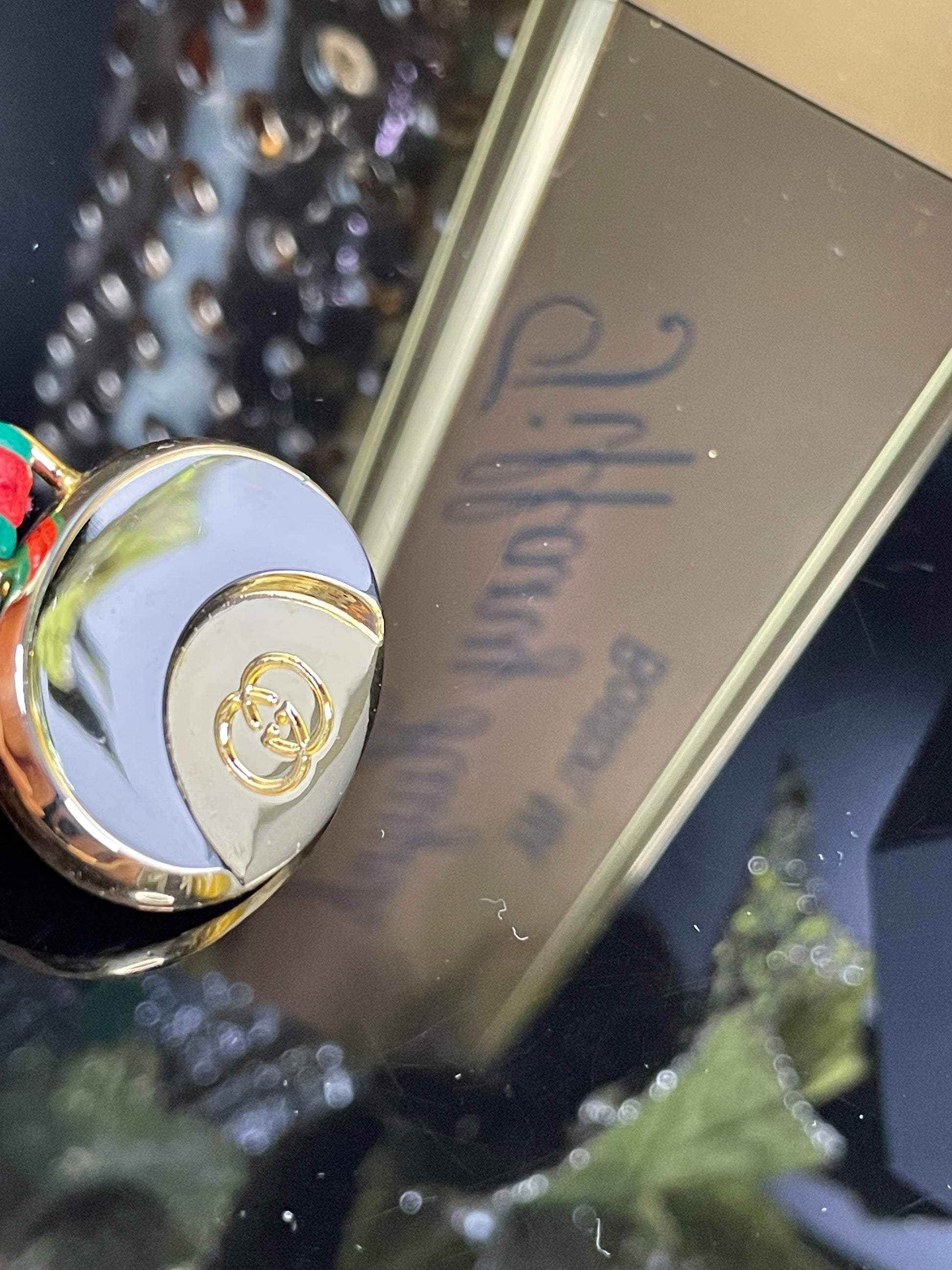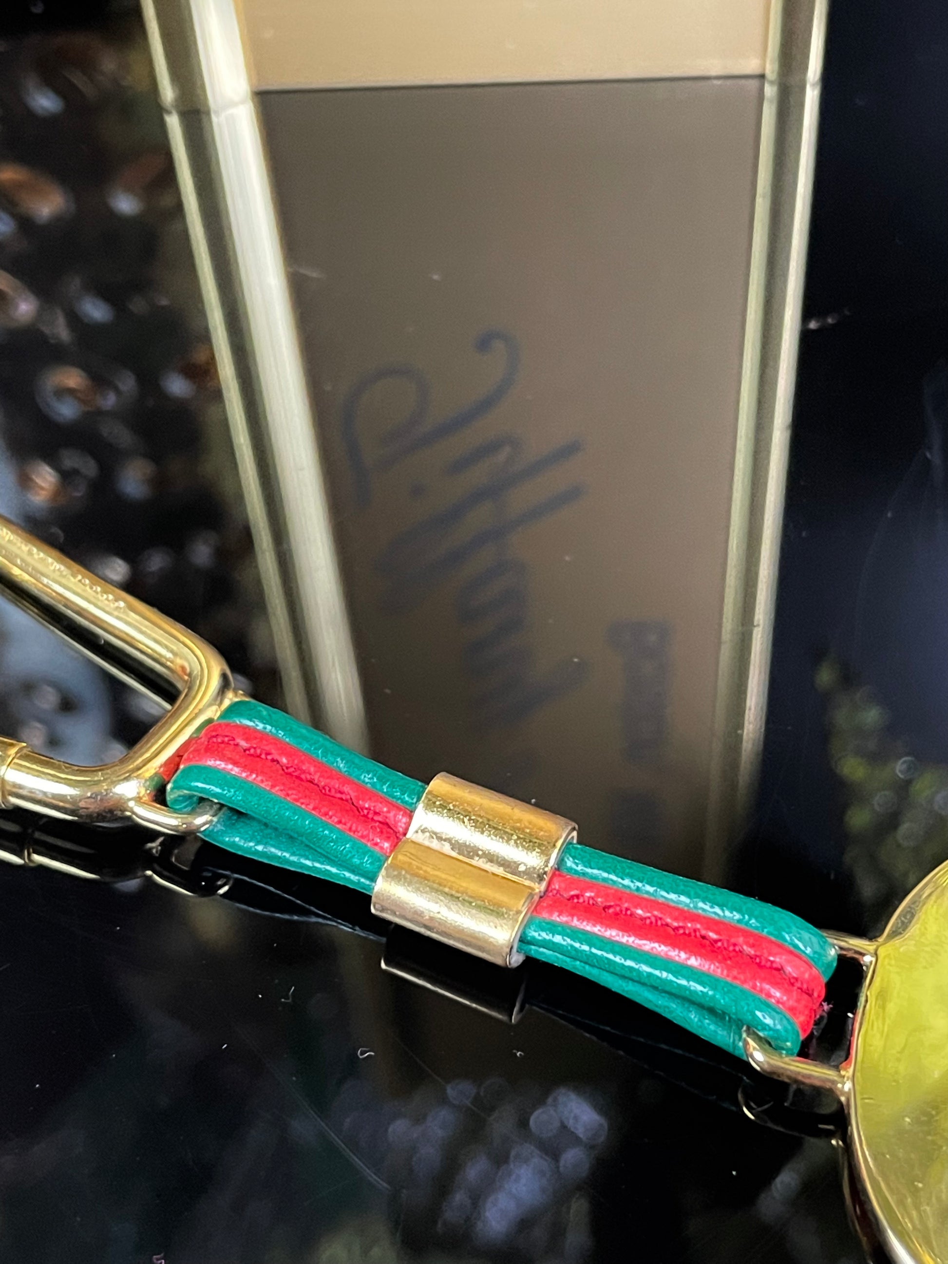 This authentic Gucci medallion combines gold and silver to create an elegant charm. The keychain features red and green sherri lines and a twist lock clasp. Can double as a keychain or bag charm.