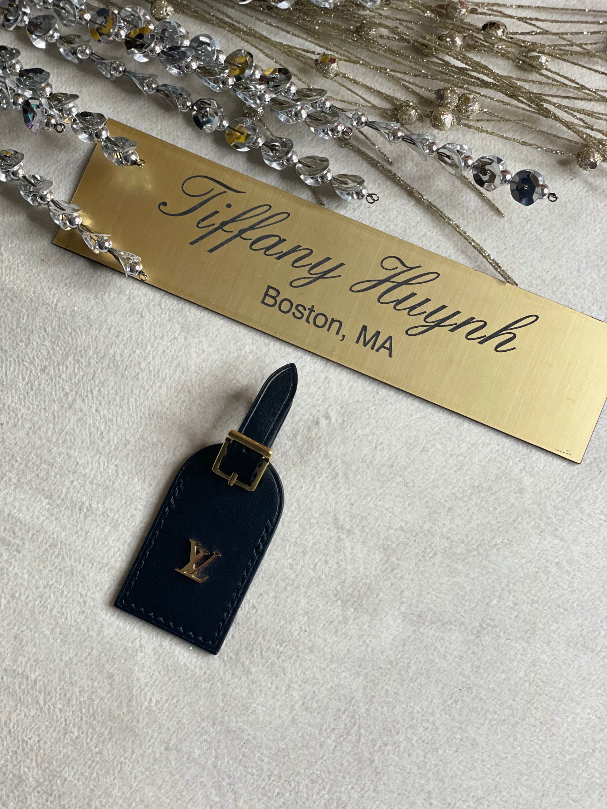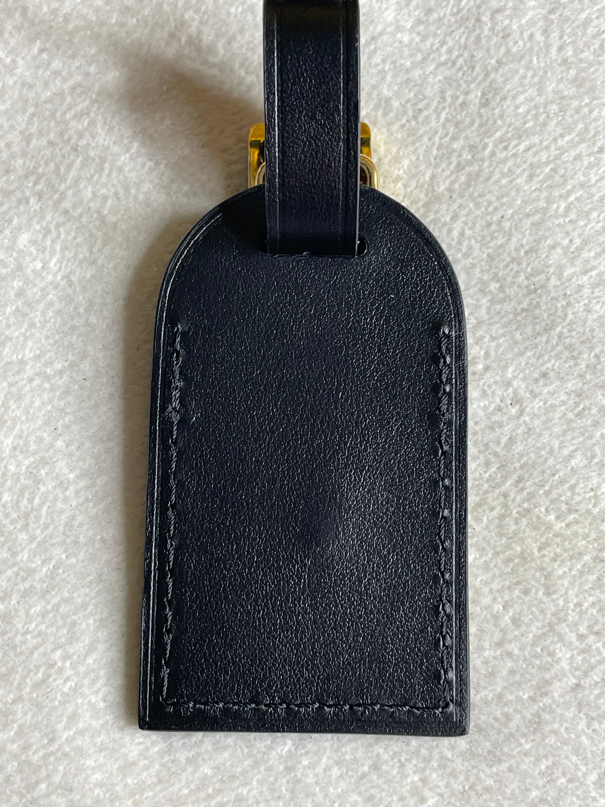 This Luggage tag is made from black leather and has gold toned hardware featuring the LV monogram.